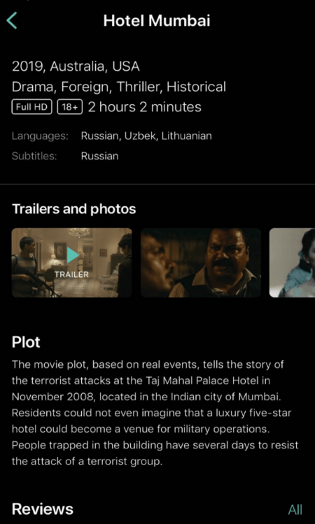 Картка з кожним фільмом містить інформацію про роботу (опис, список акторів, оцінки IMDb і «Пошук фільму»), а також показує, скільком користувачам сподобалася або не сподобалася стрічка. Присутні й рекомендації «Що ще подивитися», і відгуки користувачів. Ви також можете залишати коментарі з мобільного додатку. Ви можете не тільки дивитися фільми відразу, але і додавати їх в «Переглянути пізніше» або ділитися посиланням на роботи.